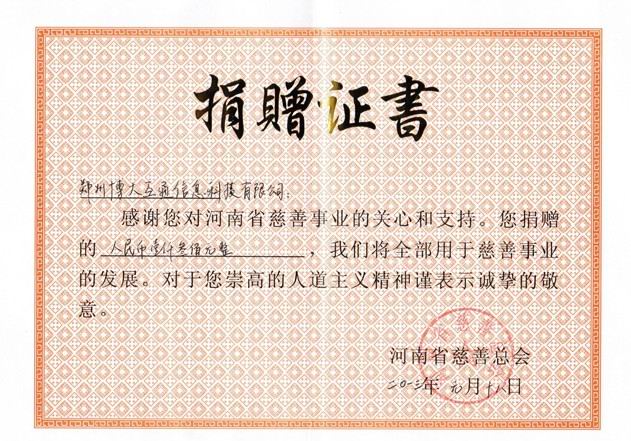 河南省慈善总会颁发博大互通捐赠证书